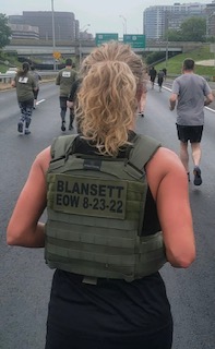 Matt’s sister, Samantha, running in his memory, at the Annual National Law Enforcement Memorial Race, wearing his SWAT body armor.